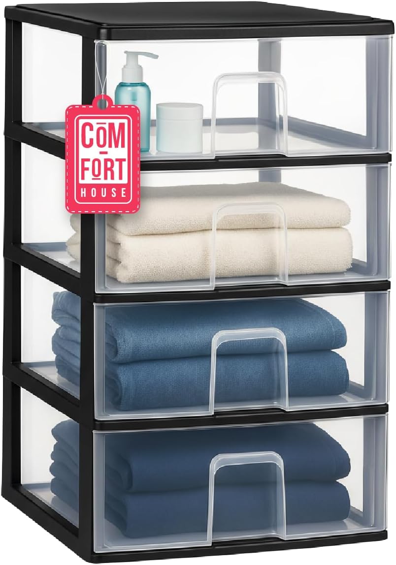 COM-FORT HOUSE | Cajonera Apilable de Plástico | Modelo Transparente | Color Negro | Modelo de 3 Cajones | Cajones de Almacenamiento Modular