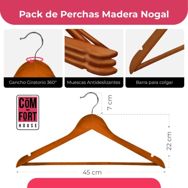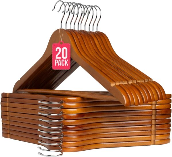 COM-FORT HOUSE – Pack de 20 Perchas de Madera Maciza Nogal con Gancho Giratorio 360° y Muescas Antideslizantes – con Barra para Pantalones – Alta Resistencia